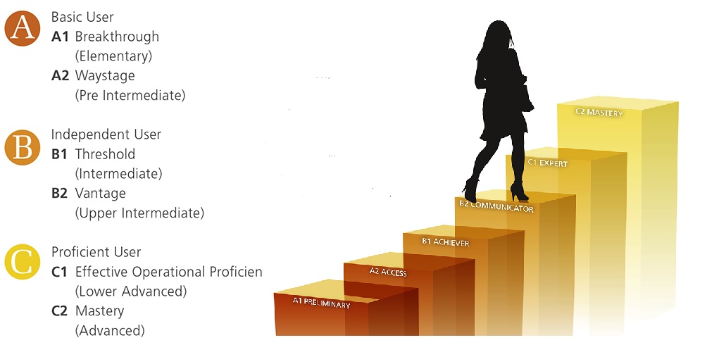 Diese sind nochmals unterteilt und ergeben 6 Niveaustufen des Sprachkenntnisse.