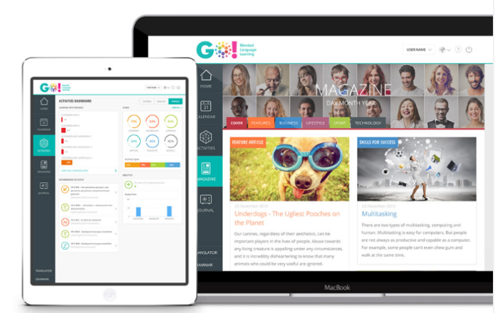 All das basiert auf modernster Technologie. Die Plattform passt sich an das jeweilige Gerät an: ob Desktop oder Tablet - Sie können auf Ihrer Go! Plattform die Anzahl und Arten der erledigten Aufgaben sowie die laufenden Aktivitäten, den Prozentsatz der richtigen Antworten, die investierte Lernzeit, den Kalender und alle bisherigen Lernberichte ersehen.